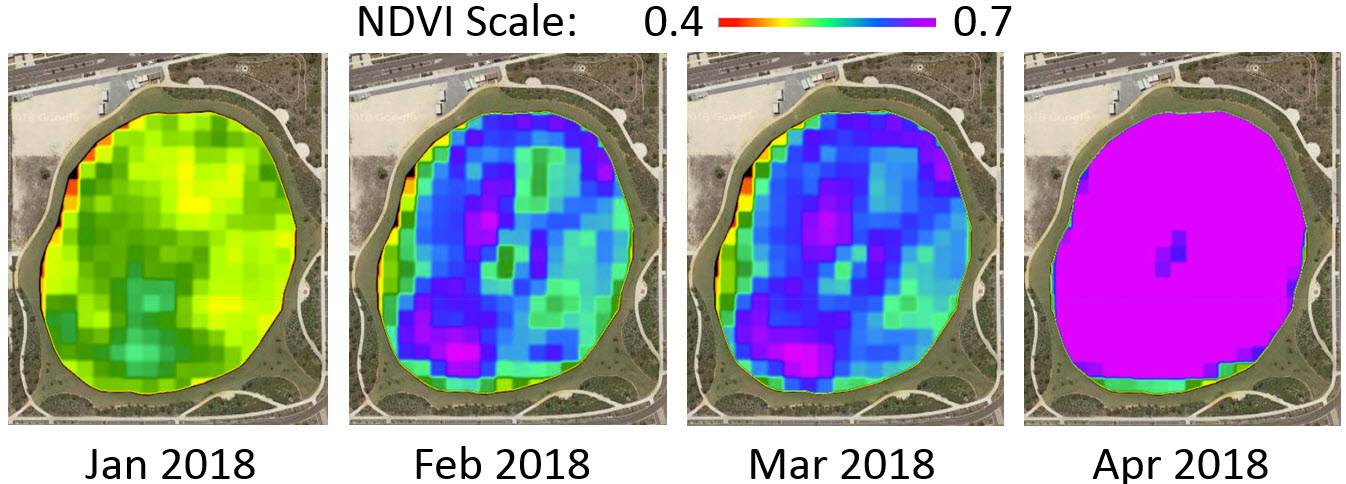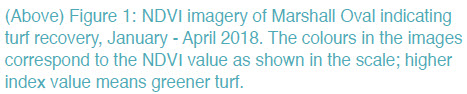 The satellite imagery provides a record of turf health throughout the irrigation season (Figure 1). The results of a number of management events can be observed. Following a pump breakdown over the New Year period, extensive renovation of the oval, including fertiliser application, was done during January, 2018. Another foliar fertiliser application was done in late March. Accordingly, the oval exhibited its lowest NDVI (indicating the poorest turf health) in January and later imagery shows turf recovery peaking in April, 2018, reflecting the success of the renovation and other management initiatives.