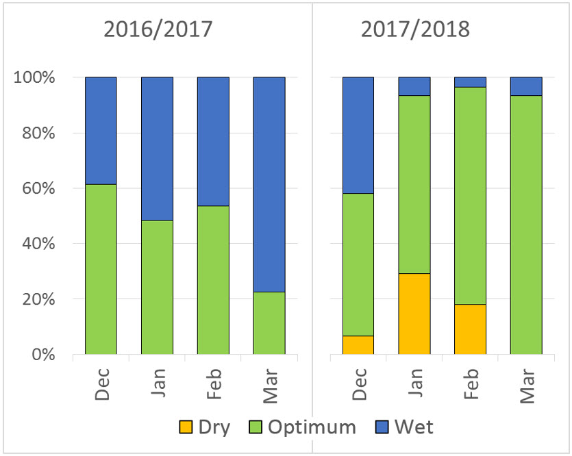 The trial used SWAN to set budgets and track irrigation application, soil moisture and drainage. SWAN estimates drainage as the amount of water that is surplus to plant needs and which thus drains below the root zone. In aggregate the data indicate significant water savings along with better management of soil moisture status. Specifically, there was a 20% water saving in 2017/18 compared to 2016/17 for the September – April irrigation season (Table 1). This in turn resulted in 40% less drainage from over-irrigation, an important improvement, especially in areas where the risk to water quality from nutrient leaching is high. Associated with these savings, soils were maintained much closer to the “Optimum” soil moisture in 2017/18 than 2016/17, during which the soil was much more frequently found to be “Wet” (Figure 2).