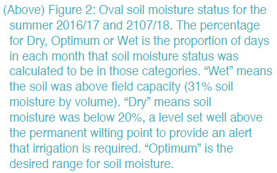 Irrigation uniformity is high and loggers have automatically collected flow and soil moisture data for more than two years. The approach for this trial was to upload historical daily data to SWAN for the 2016/2017 season and collect data for the 2017/2018 season in real time. The 2016/17 season was analysed with the benefit of hindsight and the 2017/18 season was actively managed from January 2018 onwards using daily collected data, and supported by turf management advice from Sports Turf Technology.